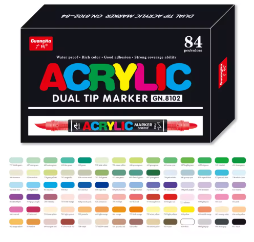 ערכת הטושים האקריליים של Guangna כוללת 84 צבעים איכותיים עם שני קצוות שימושיים במיוחד בצד אחד מברשת רכה ונוחה לצביעה מהירה ובצד השני קצה דק ומדויק המיועד לקווים קטנים ופרטים עדינים